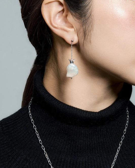 王冠モチーフを取り入れたピアスは、どこかクラシカルながらも、可愛い印象です。2つと同じ形がないバロックパールが美しく輝きます。