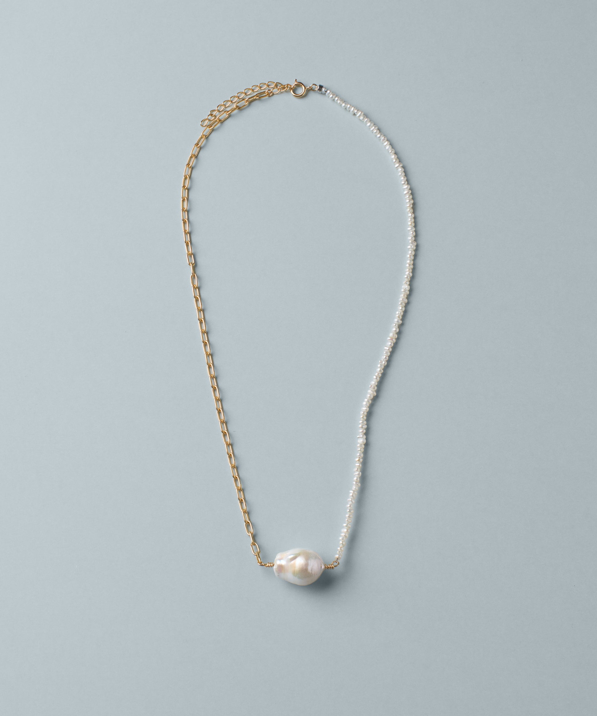 一粒のバロックパールにベビーパールとチェーンの組合せで、幅広く演出が出来る汎用性の高いネックレスに仕上げました。